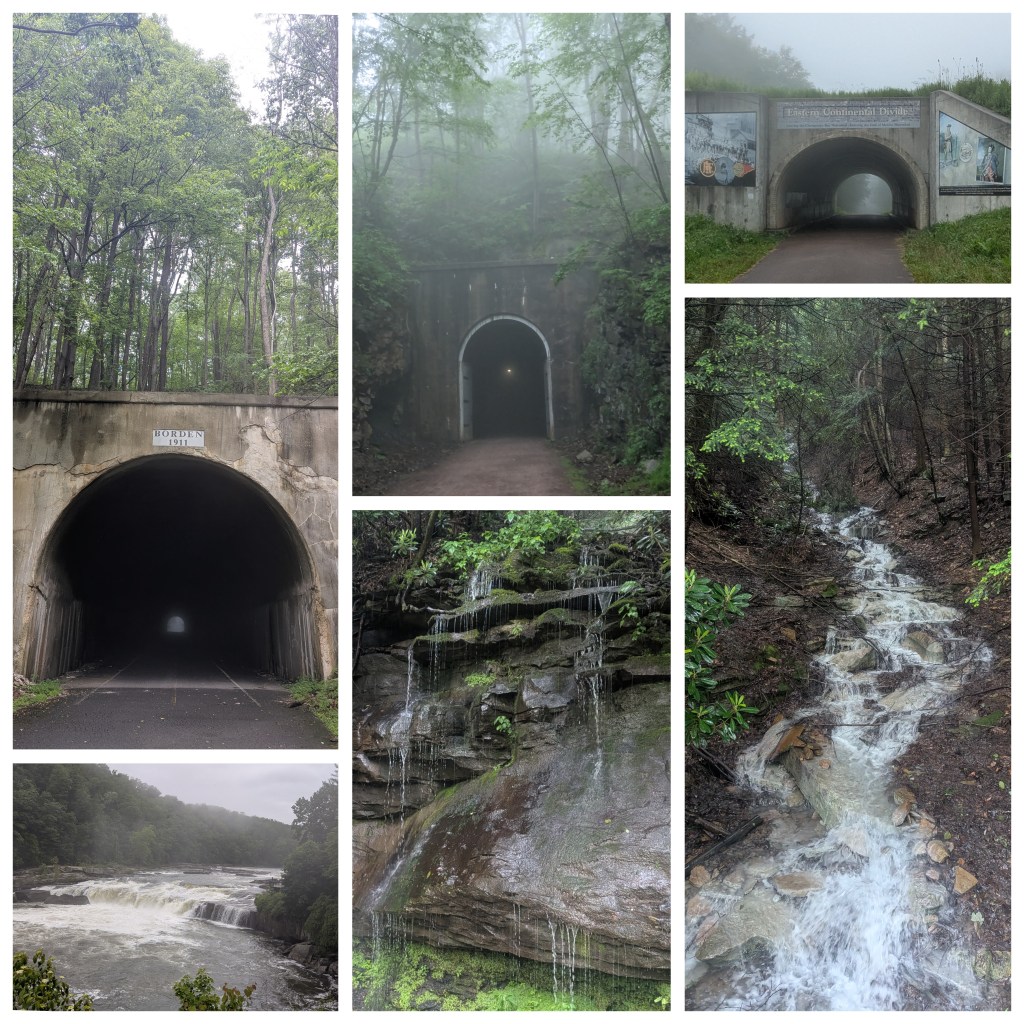 Foggy climb crossing the Mason-Dixon Line up the rest of the hill. Top of the hill is the Eastern Continental Divide and all the water on this side empties into the Gulf of Mexico. It was a long day of tunnels and waterfalls and an afternoon of riding in the rain. Very pretty. Very wet. π² 58 miles
