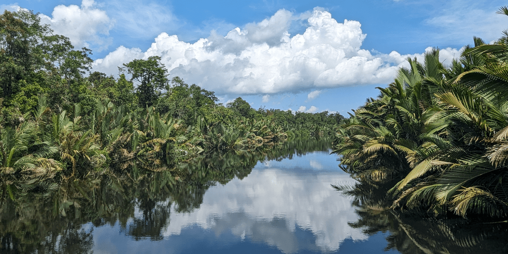The island of Borneo is divided in two, the north side belonging to Malaysia and the south side to Indonesia (known as Kalimantan). For this trip, I took an early, early morning flight to Pangkalan Bun and was driven to a spot on the Java Sea that connects to the river that goes through Tanjung Puting National Park. My guide ushered me on board our klotok, a houseboat that would be my home for the next couple of nights. While I was waiting for the boat to get moving, I lay down on my full-sized mattress on the top deck and promptly fell asleep. An hour or so later, I woke up to this gorgeous scene: