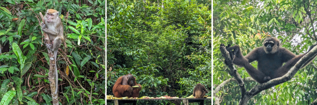 And, of course, some of the other animals wanted in on the action. The long-tailed macaques were good at rushing in and making off with a banana or two and eating them elsewhere. At one of the feeding stations, a Bornean white-bearded gibbon was actively waiting for the food to arrive. Eventually it did, and he scampered down and tentatively hung out on the platform for a minute, gathering his food before he took off.
