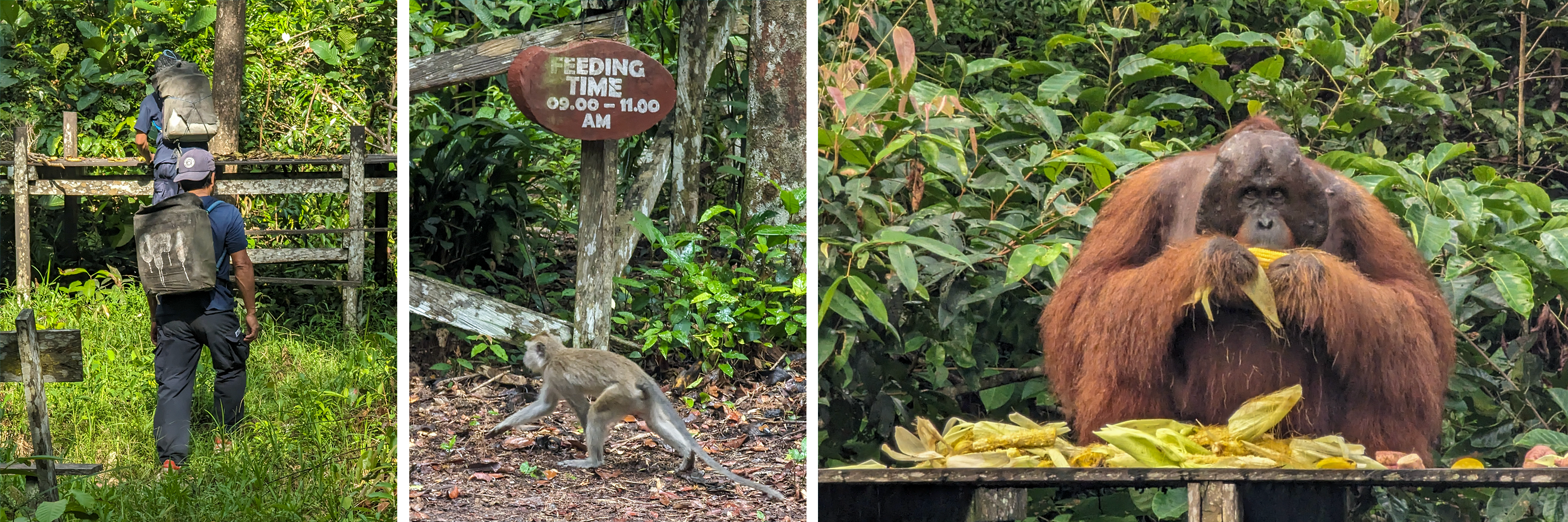 rangers, a macaque trying to get in on the action, male orangutan enjoying corn