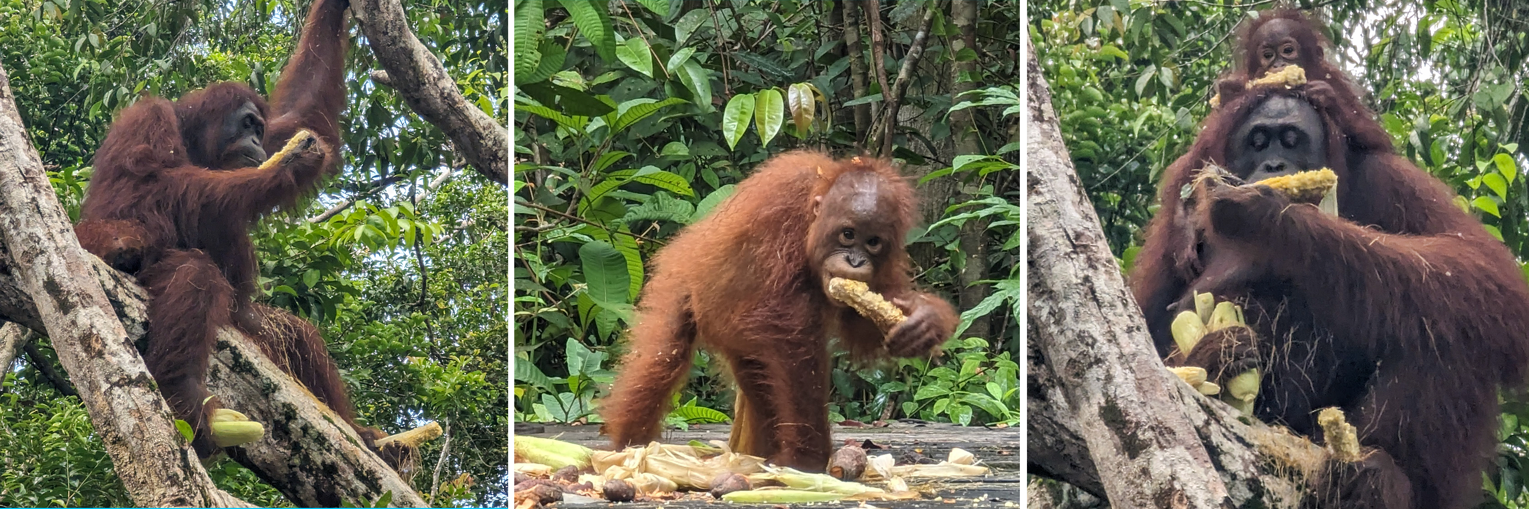 Corn was a preferred food and often the orangutans would take as many ears with them as they could to a nearby tree, safely away from where another animals could take their food. They tended to climb with a few ears of corns in their hands, but once they started eating, they held onto the extra ones with their toes.