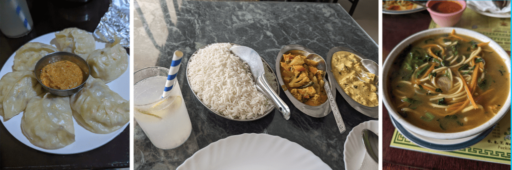 I ate thukpa (a Tibetan noodle soup made with curry powder and vegetables) at the highly recommended Kunga’s Restaurant in Darjeeling. I waited in line for about twenty minutes and was about to give up when a woman came out and said she had room for one. I ended up sharing a table with a Bengali couple from Kolkata who were taking a long holiday weekend in the highland cooler temperatures. The whole restaurant had maybe seven or eight tables with barely any room to walk. Just as I sat down and ordered my food, the entire staff sat down around the one big table in back to eat their lunch. My new friends shared travel and festival recommendations from Kolkata while we waited a rather long time for our food to arrive. However, when it finally came, the soup was delicious and I even ordered some steamed vegetable momos to go.