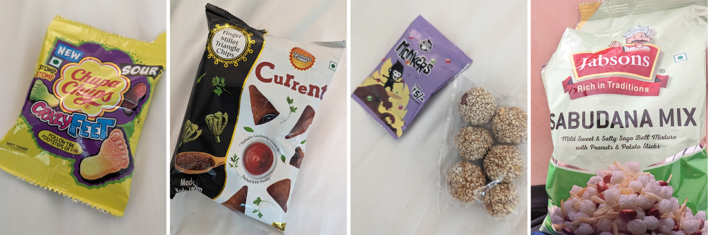 gummy feet, millet bugles, monkers (like m&ms) and sesame balls, sabudana mix