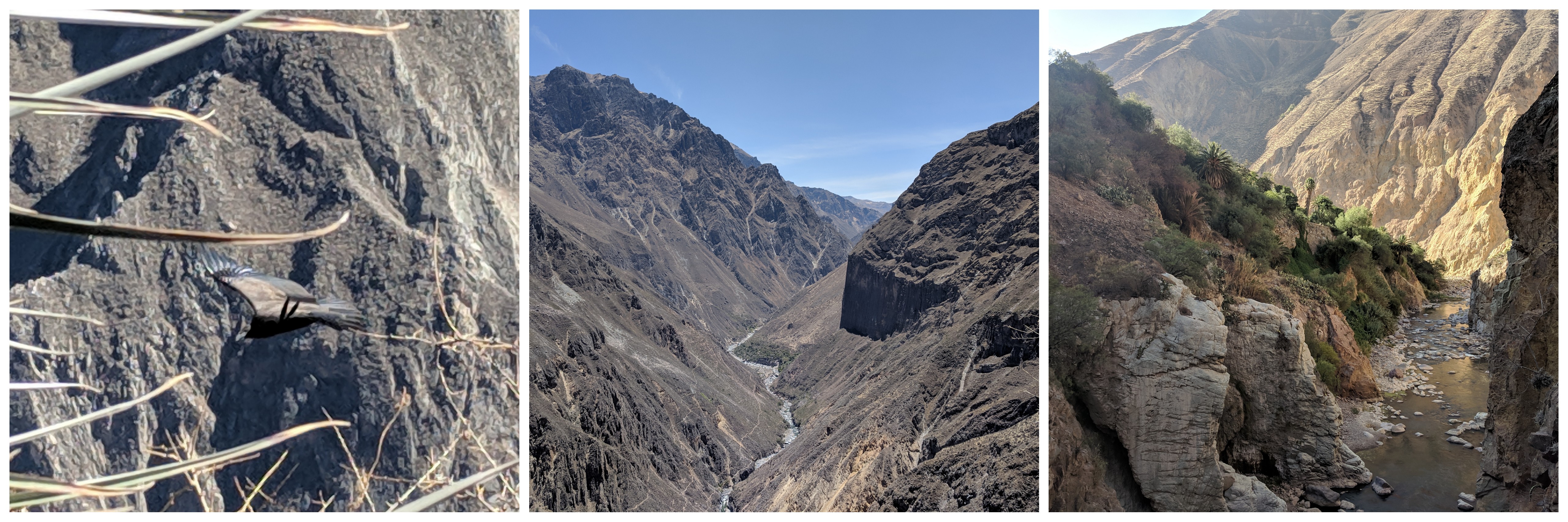 On the way to the canyon, there is a famous stopping point known as the Cruz del Condor where there are almost always Andean condors flying in the morning hours. This point is at the cross-section of winds and the condors ride them all morning scavenging for food. We saw quite a few before venturing on to start our trip into one of the deepest canyons in the world. This overnight hike into Colca Canyon involved a really, really long and really, really hot walk down into the canyon and a really, really steep hike out in the morning starting while there were still stars out.
